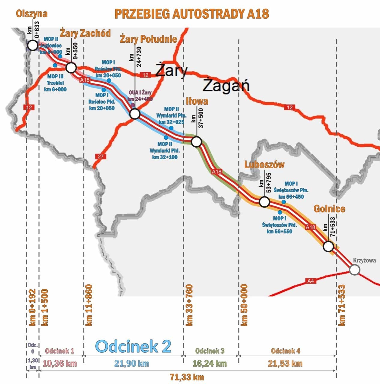 Rozbudowę drogi krajowej nr 18 do parametrów autostrady na odcinku Żary Wschód – Iłowa prowadziło konsorcjum firm KOBYLARNIA S.A. (lider konsorcjum) i MIRBUD S.A. (partner konsorcjum), ale pracami budowlanymi objęty jest cały, 70-kilometrowy odcinek DK18 od Golnic w województwie dolnośląskim do granicy niemieckiej w miejscowości Olszyna w Lubuskiem. Realizację dwóch odcinków, tj. odcinek Żary Wschód – Iłowa oraz od granicy województwa lubuskiego do Golnic GDDKiA zleciła konsorcjum firm z Grupy MIRBUD - KOBYLARNIA S.A. oraz MIRBUD S.A. Zadanie polegało na przebudowie jezdni południowej do parametrów autostrady z zastosowaniem betonowej nawierzchni.