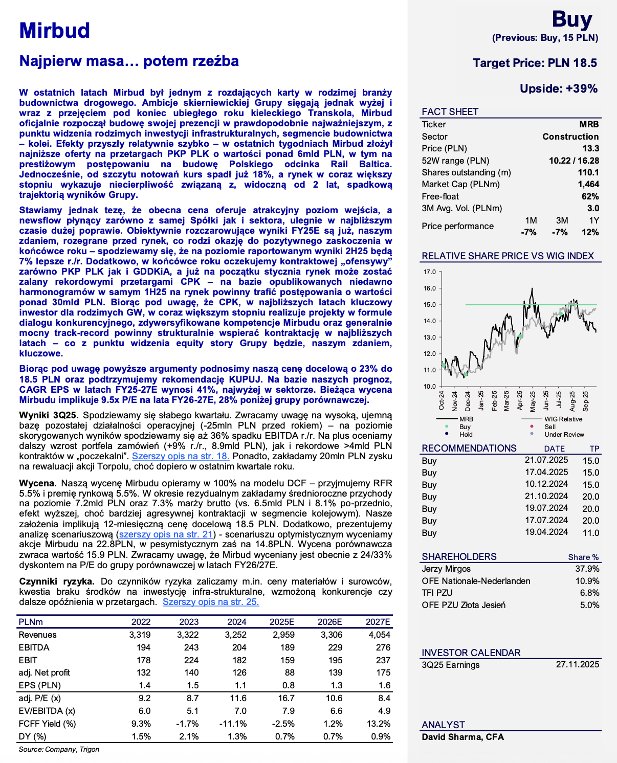 „W ostatnich latach Mirbud był jednym z rozdających karty w rodzimej branży budownictwa drogowego. Ambicje skierniewickiej Grupy sięgają jednak wyżej i wraz z przejęciem pod koniec ubiegłego roku kieleckiego Transkolu, Mirbud oficjalnie rozpoczął budowę swojej prezencji w prawdopodobnie najważniejszym, z punktu widzenia rodzimych inwestycji infrastrukturalnych, segmencie budownictwa – kolei.” – pisze David Sharma z DM TRIGON.