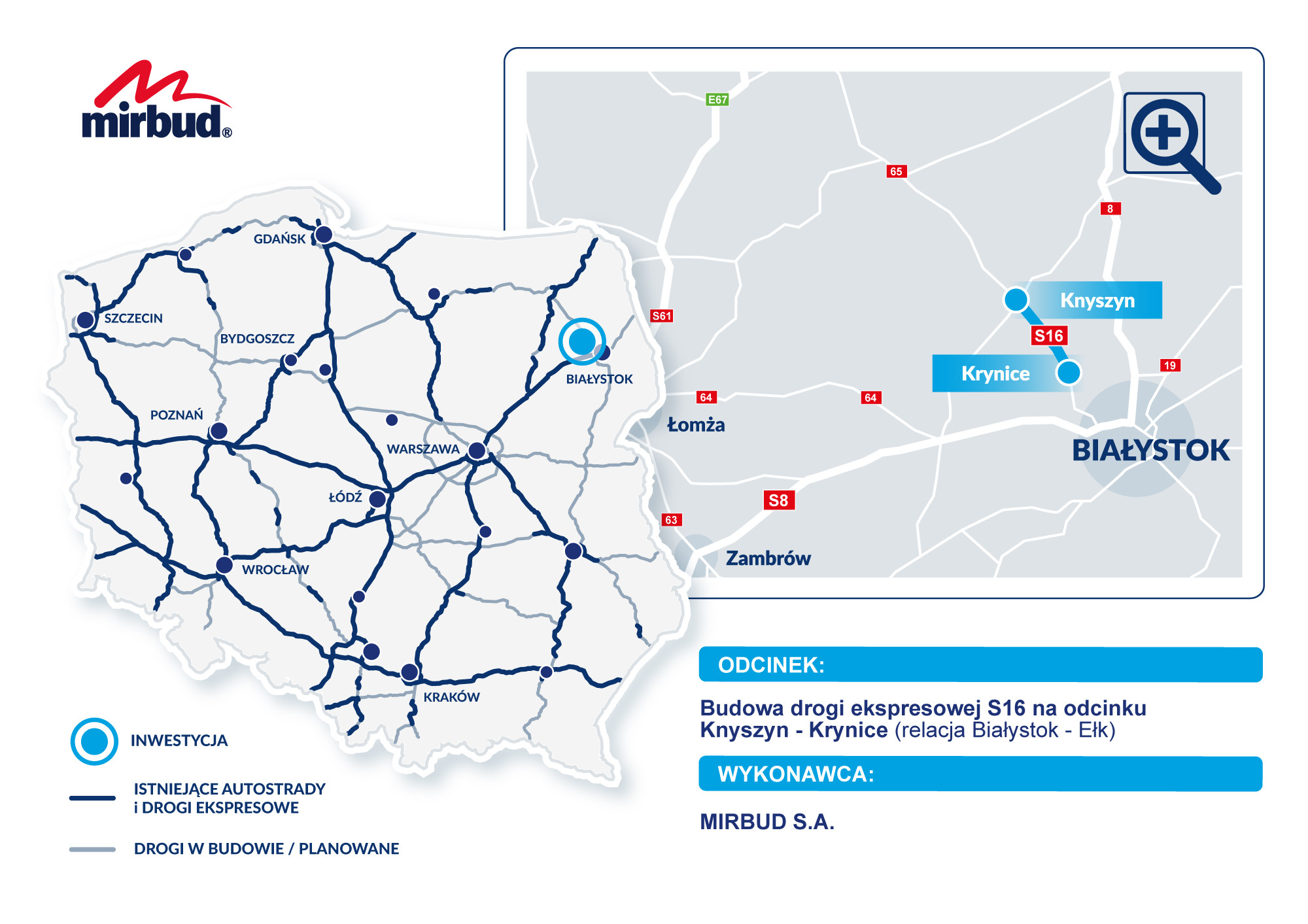 Mirbud rozpocznie realizację inwestycji infrastruktury drogowej w północno‑wschodniej Polsce. Wojewoda Podlaski wydał decyzję o zezwoleniu na realizację inwestycji drogowej (ZRID) dla odcinka drogi ekspresowej S16 pomiędzy Knyszynem a Krynicami (relacja Białystok-Ełk), co oznacza zgodę na rozpoczęcie robót budowlanych.